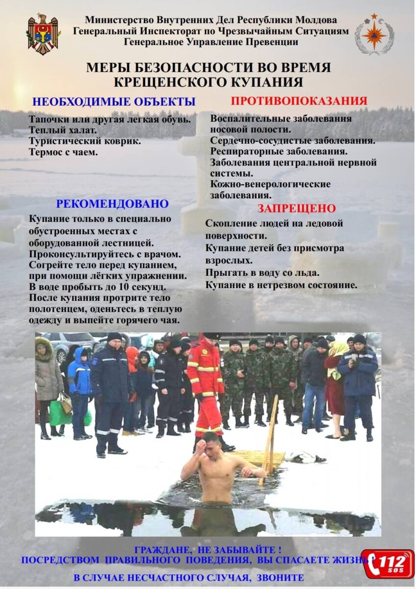 Генеральный Инспекторат по Чрезвычайным Ситуациям предупреждает о мерах безопасности во время купания на крещенские праздникиНовостиГлавная 1Главная 2 Добавлено 18 января, 2022, 22:51 716 Поделиться