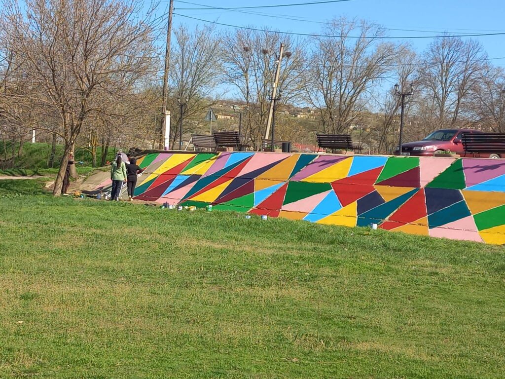 Одним из главных элементов обновления стала роспись бетонных плит на склоне. Вместо привычной серой поверхности здесь теперь — яркая геометрическая композиция из насыщенных цветов: жёлтого, зелёного, синего, красного и фиолетового. Орнамент выглядит динамично и современно, превращая обычный участок в заметную арт-зону.